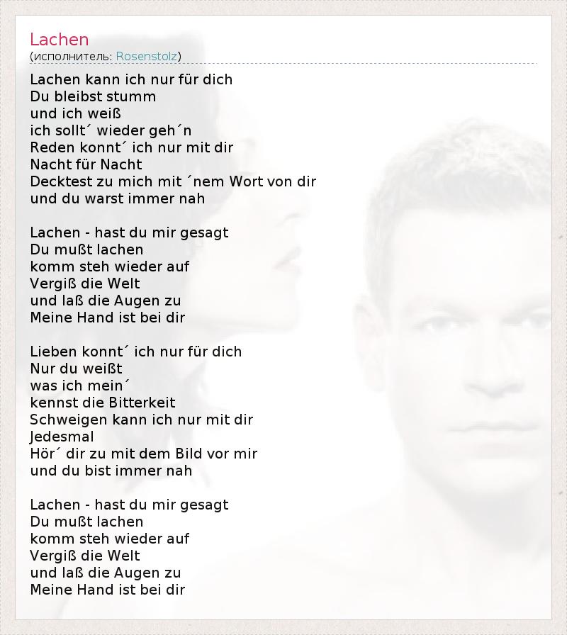 Lachen Канн Ich нур фюр Dich Du bleibst Штумм унд ич Вайс ич sollt' Wieder geh'n Reden konnt' ич нур мит реж Nacht für Nacht Decktest Zu Mich MIT 'nem сусла фон реж унд дю warst Immer Нах Lachen - Ты дю мир gesagt Du mußt Lachen Комм STEH Wieder Ауф Vergiss Die Welt унд девушка умирает Augen ZU Моя рука ист -бай реж LIEBEN konnt' ич нур фюр Dich Нур -дю weißt был ич mein' Kennst умереть Bitterkeit Schweigen Канн Ich нур мит реж Jedesmal Hör' реж цу мит дем Bild вор мир унд дю БИСТ Immer Нах Lachen - Ты дю мир gesagt Du mußt Lachen Комм STEH Wieder Ауф Vergiss Die Welt унд девушка умирает Augen ZU Моя рука ист -бай реж
