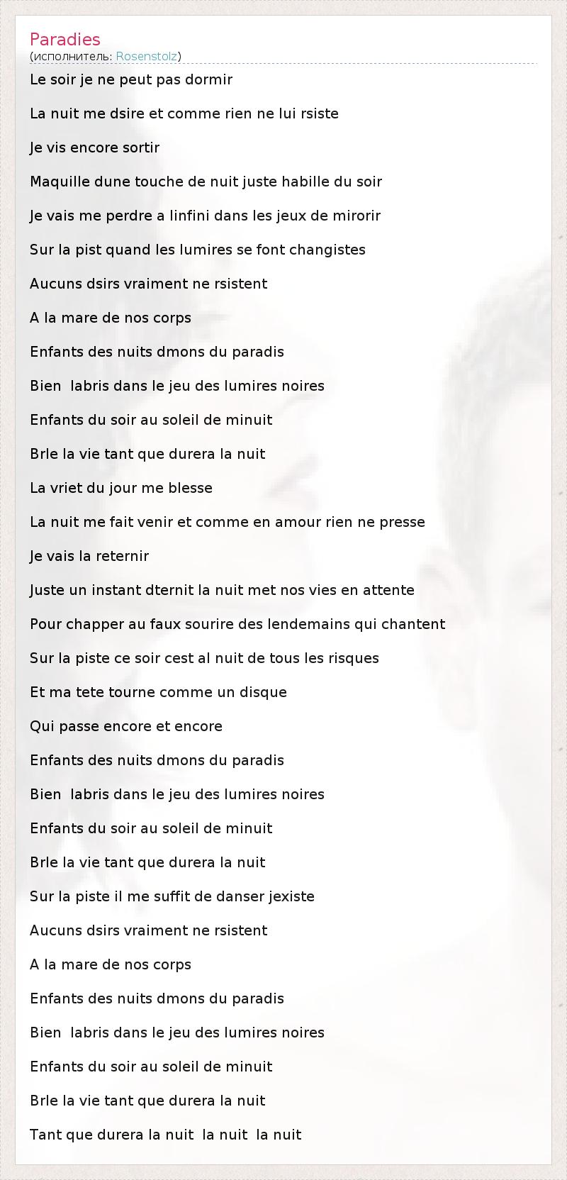 Le soir je ne peut pas dormir La nuit me dsire et comme rien ne lui rsiste Je vis encore sortir Maquille dune touche de nuit juste habille du soir Je vais me perdre a linfini dans les jeux de mirorir Sur la pist quand les lumires se font changistes Aucuns dsirs vraiment ne rsistent A la mare de nos corps Enfants des nuits dmons du paradis Bien labris dans le jeu des lumires noires Enfants du soir au soleil de minuit Brle la vie tant que durera la nuit La vriet du jour me blesse La nuit me fait venir et comme en amour rien ne presse Je vais la reternir Juste un instant dternit la nuit met nos vies en attente Pour chapper au faux sourire des lendemains qui chantent Sur la piste ce soir cest al nuit de tous les risques Et ma tete tourne comme un disque Qui passe encore et encore Enfants des nuits dmons du paradis Bien labris dans le jeu des lumires noires Enfants du soir au soleil de minuit Brle la vie tant que durera la nuit Sur la piste il me suffit de danser jexiste Aucuns dsirs vraiment ne rsistent A la mare de nos corps Enfants des nuits dmons du paradis Bien labris dans le jeu des lumires noires Enfants du soir au soleil de minuit Brle la vie tant que durera la nuit Tant que durera la nuit la nuit la nuit