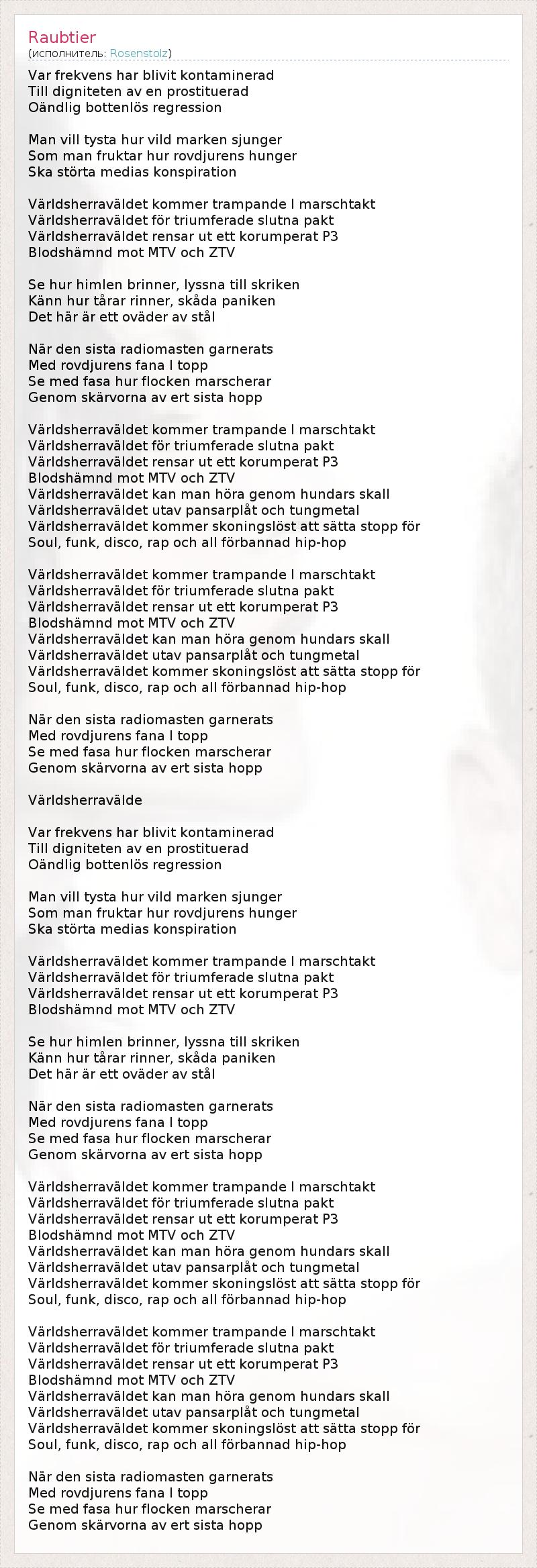 Это интересно:Rosenstolz (Розэнштольц) - музыкальный дуэт из Берлина, состоящий из вокалистки АнНы Р. (AnNa R.) и вокалиста Петера Плате (Peter Plate). Группа была основана в 1991 году в районе Берлин-Фридрихсхайн (Berlin-Friedrichshain). Песни, почти всегда на немецком языке, можно отнести к пересечению таких стилей, как поп, шансон и рок. Особенно в начале карьеры тексты группы были многозначными. В начале-середине девяностых... продолжение