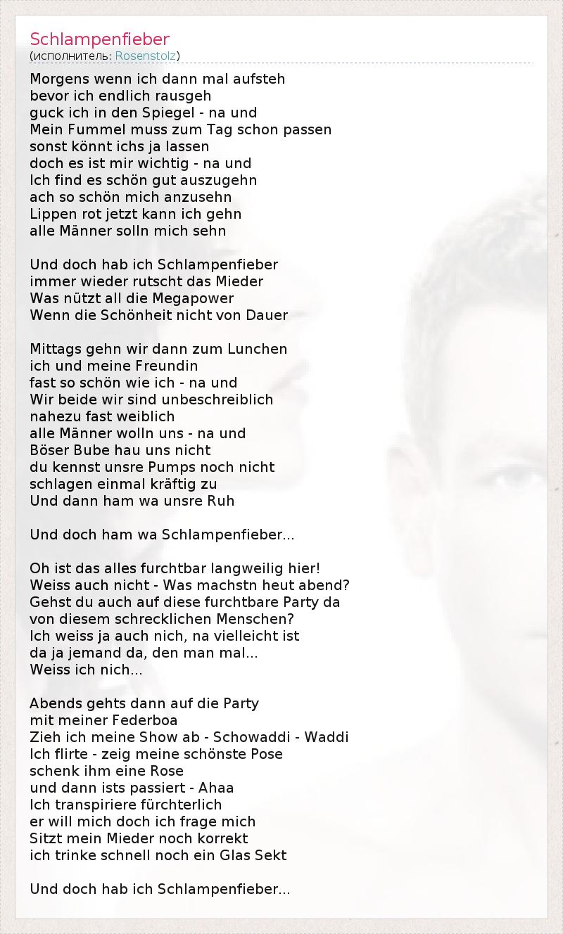 Morgens wenn ich dann mal aufsteh bevor ich endlich rausgeh guck ich in den Spiegel - na und Mein Fummel muss zum Tag schon passen sonst könnt ichs ja lassen doch es ist mir wichtig - na und Ich find es schön gut auszugehn ach so schön mich anzusehn Lippen rot jetzt kann ich gehn alle Männer solln mich sehn Und doch hab ich Schlampenfieber immer wieder rutscht das Mieder Was nützt all die Megapower Wenn die Schönheit nicht von Dauer Mittags gehn wir dann zum Lunchen ich und meine Freundin fast so schön wie ich - na und Wir beide wir sind unbeschreiblich nahezu fast weiblich alle Männer wolln uns - na und Böser Bube hau uns nicht du kennst unsre Pumps noch nicht schlagen einmal kräftig zu Und dann ham wa unsre Ruh Und doch ham wa Schlampenfieber... Oh ist das alles furchtbar langweilig hier! Weiss auch nicht - Was machstn heut abend? Gehst du auch auf diese furchtbare Party da von diesem schrecklichen Menschen? Ich weiss ja auch nich, na vielleicht ist da ja jemand da, den man mal... Weiss ich nich... Abends gehts dann auf die Party mit meiner Federboa Zieh ich meine Show ab - Schowaddi - Waddi Ich flirte - zeig meine schönste Pose schenk ihm eine Rose und dann ists passiert - Ahaa Ich transpiriere fürchterlich er will mich doch ich frage mich Sitzt mein Mieder noch korrekt ich trinke schnell noch ein Glas Sekt Und doch hab ich Schlampenfieber...