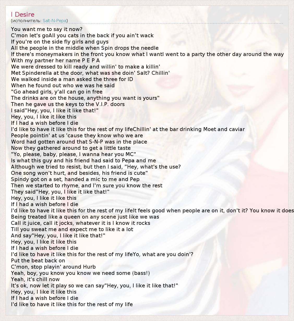 Это интересно:Напомню сразу, что SALT’N’PEPA — это женское трио из Америки.Cheryl ‘Salt’ James родом из нью–йоркского района Бруклин. Sandy‘Pepa’ Denton (р. 9.10.1969 г.) родилась на Ямайке, но росла также в Нью–Йорке (район Куинс). Обе семьи были многодетными.Дамочки познакомились в колледже, затем окончания которого могли начинать воспитателями в детском саду. Обе стали подрабатывать в супермаркете под названием... продолжение