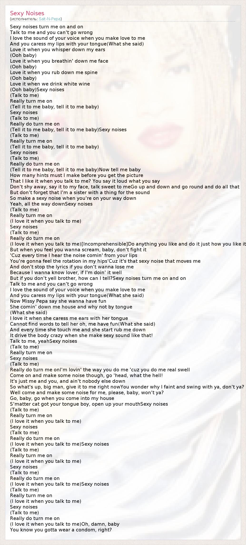 Sexy noises turn me on and on Talk to me and you can't go wrong I love the sound of your voice when you make love to me And you caress my lips with your tongue(What she said) Love it when you whisper down my ears (Ooh baby) Love it when you breathin' down me face (Ooh baby) Love it when you rub down me spine (Ooh baby) Love it when we drink white wine (Ooh baby)Sexy noises (Talk to me) Really turn me on (Tell it to me baby, tell it to me baby) Sexy noises (Talk to me) Really do turn me on (Tell it to me baby, tell it to me baby)Sexy noises (Talk to me) Really turn me on (Tell it to me baby, tell it to me baby) Sexy noises (Talk to me) Really do turn me on (Tell it to me baby, tell it to me baby)Now tell me baby How many hints must I make before you get the picture That I like it when you talk to me? You say it loud what you say Don't shy away, say it to my face, talk sweet to meGo up and down and go round and do all that But don't forget that I'm a sister with a thing for the sound So make a sexy noise when you're on your way down Yeah, all the way downSexy noises (Talk to me) Really turn me on (I love it when you talk to me) Sexy noises (Talk to me) Really do turn me on (I love it when you talk to me)[Incomprehensible]Do anything you like and do it just how you like it But when you feel you wanna scream, baby, don't fight it 'Cuz every time I hear the noise comin' from your lips You're gonna feel the rotation in my hips'Cuz it's that sexy noise that moves me And don't stop the lyrics if you don't wanna lose me Because I wanna know lover, if I'm doin' it well But if you don't yell brother, how can I tell?Sexy noises turn me on and on Talk to me and you can't go wrong I love the sound of your voice when you make love to me And you caress my lips with your tongue(What she said) Now Missy Pepa say she wanna have fun She comin' down me house and why not by tongue (What she said) I love it when she caress me ears with her tongue Cannot find words to tell her oh, me have fun(What she said) And every time she touch me and she start rub me down It drive the body crazy when she make sexy sound like that! Talk to me, yeahSexy noises (Talk to me) Really turn me on Sexy noises (Talk to me) Really do turn me onI'm lovin' the way you do me 'cuz you do me real swell Come on and make some noise though, go 'head, what the hell! It's just me and you, and ain't nobody else down So what's up, big man, give it to me right nowYou wonder why I faint and swing with ya, don't ya? Well come and make some noise for me, please, baby, won't ya? Go, baby, go when you come into my house S'matter cat got your tongue boy, open up your mouthSexy noises (Talk to me) Really turn me on (I love it when you talk to me) Sexy noises (Talk to me) Really do turn me on (I love it when you talk to me)Sexy noises (Talk to me) Really turn me on (I love it when you talk to me) Sexy noises (Talk to me) Really do turn me on (I love it when you talk to me)Sexy noises (Talk to me) Really turn me on (I love it when you talk to me) Sexy noises (Talk to me) Really do turn me on (I love it when you talk to me)Oh, damn, baby You know you gotta wear a condom, right?