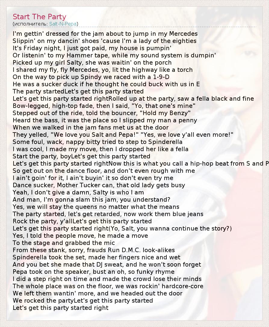 I'm gettin' dressed for the jam about to jump in my Mercedes Slippin' on my dancin' shoes 'cause I'm a lady of the eighties It's Friday night, I just got paid, my house is pumpin' Or listenin' to my Hammer tape, while my sound system is dumpin' Picked up my girl Salty, she was waitin' on the porch I shared my fly, fly Mercedes, yo, lit the highway like a torch On the way to pick up Spindy we raced with a 1-9-D He was a sucker duck if he thought he could buck with us in E The party startedLet's get this party started Let's get this party started rightRolled up at the party, saw a fella black and fine Bow-legged, high-top fade, then I said, "Yo, that one's mine" Stepped out of the ride, told the bouncer, "Hold my Benzy" Heard the bass, it was the place so I slipped my man a penny When we walked in the jam fans met us at the door They yelled, "We love you Salt and Pepa!" "Yes, we love y'all even more!" Some foul, wack, nappy bitty tried to step to Spinderella I was cool, I made my move, then I dropped her like a fella Start the party, boyLet's get this party started Let's get this party started rightNow this is what you call a hip-hop beat from S and P So get out on the dance floor, and don't even rough with me I ain't goin' for it, I ain't buyin' it so don't even try me Dance sucker, Mother Tucker can, that old lady gets busy Yeah, I don't give a damn, Salty is who I am And man, I'm gonna slam this jam, you understand? Yes, we will stay the queens no matter what the means The party started, let's get retarded, now work them blue jeans Rock the party, y'allLet's get this party started Let's get this party started right(Yo, Salt, you wanna continue the story?) Yes, I told the people move, he made a move To the stage and grabbed the mic From these stank, sorry, frauds Run D.M.C. look-alikes Spinderella took the set, made her fingers nice and wet And you bet she made that DJ sweat, and he won't soon forget Pepa took on the speaker, bust an oh, so funky rhyme I did a step right on time and made the crowd lose their minds The whole place was on the floor, we was rockin' hardcore-core We left them wantin' more, and we headed out the door We rocked the partyLet's get this party started Let's get this party started right