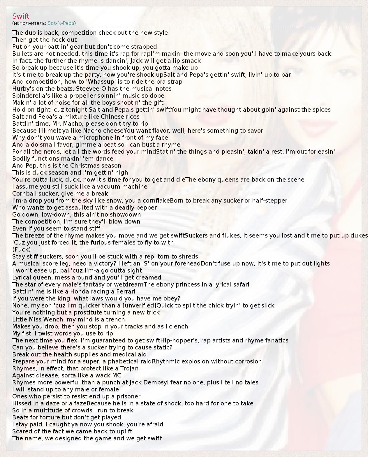 Hold on tight 'cuz tonight Salt and Pepa's gettin' swiftYou might have thought about goin' against the spices