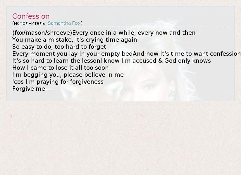 Every moment you lay in your empty bedAnd now it's time to want confession