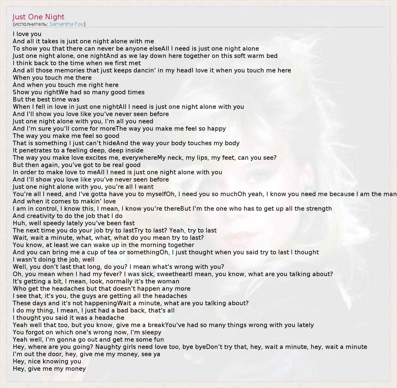 I love you And all it takes is just one night alone with me To show you that there can never be anyone elseAll I need is just one night alone Just one night alone, one nightAnd as we lay down here together on this soft warm bed I think back to the time when we first met And all those memories that just keeps dancin' in my headI love it when you touch me here When you touch me there And when you touch me right here Show you rightWe had so many good times But the best time was When I fell in love in just one nightAll I need is just one night alone with you And I'll show you love like you've never seen before Just one night alone with you, I'm all you need And I'm sure you'll come for moreThe way you make me feel so happy The way you make me feel so good That is something I just can't hideAnd the way your body touches my body It penetrates to a feeling deep, deep inside The way you make love excites me, everywhereMy neck, my lips, my feet, can you see? But then again, you've got to be real good In order to make love to meAll I need is just one night alone with you And I'll show you love like you've never seen before Just one night alone with you, you're all I want You're all I need, and I've gotta have you to myselfOh, I need you so muchOh yeah, I know you need me because I am the man And when it comes to makin' love I am in control, I know this, I mean, I know you're thereBut I'm the one who has to get up all the strength And creativity to do the job that I do Huh, well speedy lately you've been fast The next time you do your job try to lastTry to last? Yeah, try to last Wait, wait a minute, what, what, what do you mean try to last? You know, at least we can wake up in the morning together And you can bring me a cup of tea or somethingOh, I just thought when you said try to last I thought I wasn't doing the job, well Well, you don't last that long, do you? I mean what's wrong with you? Oh, you mean when I had my fever? I was sick, sweetheartI mean, you know, what are you talking about? It's getting a bit, I mean, look, normally it's the woman Who get the headaches but that doesn't happen any more I see that, it's you, the guys are getting all the headaches These days and it's not happeningWait a minute, what are you talking about? I do my thing, I mean, I just had a bad back, that's all I thought you said it was a headache Yeah well that too, but you know, give me a breakYou've had so many things wrong with you lately You forgot on which one's wrong now, I'm sleepy Yeah well, I'm gonna go out and get me some fun Hey, where are you going? Naughty girls need love too, bye byeDon't try that, hey, wait a minute, hey, wait a minute I'm out the door, hey, give me my money, see ya Hey, nice knowing you Hey, give me my money