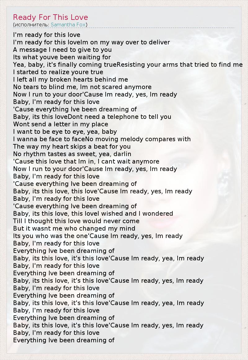I'm ready for this love I'm ready for this loveIm on my way over to deliver A message I need to give to you Its what youve been waiting for Yea, baby, it's finally coming trueResisting your arms that tried to find me I started to realize youre true I left all my broken hearts behind me No tears to blind me, Im not scared anymore Now I run to your door'Cause Im ready, yes, Im ready Baby, I'm ready for this love 'Cause everything Ive been dreaming of Baby, its this loveDont need a telephone to tell you Wont send a letter in my place I want to be eye to eye, yea, baby I wanna be face to faceNo moving melody compares with The way my heart skips a beat for you No rhythm tastes as sweet, yea, darlin 'Cause this love that Im in, I cant wait anymore Now I run to your door'Cause Im ready, yes, Im ready Baby, I'm ready for this love 'Cause everything Ive been dreaming of Baby, its this love, this love'Cause Im ready, yes, Im ready Baby, I'm ready for this love 'Cause everything Ive been dreaming of Baby, its this love, this loveI wished and I wondered Till I thought this love would never come But it wasnt me who changed my mind Its you who was the one'Cause Im ready, yes, Im ready Baby, I'm ready for this love Everything Ive been dreaming of Baby, its this love, it's this love'Cause Im ready, yea, Im ready Baby, I'm ready for this love Everything Ive been dreaming of Baby, its this love, it's this love'Cause Im ready, yes, Im ready Baby, I'm ready for this love Everything Ive been dreaming of Baby, its this love, it's this love'Cause Im ready, yea, Im ready Baby, I'm ready for this love Everything Ive been dreaming of Baby, its this love, it's this love'Cause Im ready, yes, Im ready Baby, I'm ready for this love Everything Ive been dreaming of