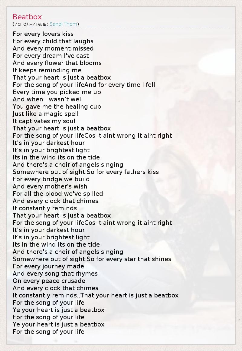 For every lovers kiss For every child that laughs And every moment missed For every dream I've cast And every flower that blooms It keeps reminding me That your heart is just a beatbox For the song of your lifeAnd for every time I fell Every time you picked me up And when I wasn't well You gave me the healing cup Just like a magic spell It captivates my soul That your heart is just a beatbox For the song of your lifeCos it aint wrong it aint right It's in your darkest hour It's in your brightest light Its in the wind its on the tide And there's a choir of angels singing Somewhere out of sight.So for every fathers kiss For every bridge we build And every mother's wish For all the blood we've spilled And every clock that chimes It constantly reminds That your heart is just a beatbox For the song of your lifeCos it aint wrong it aint right It's in your darkest hour It's in your brightest light Its in the wind its on the tide And there's a choir of angels singing Somewhere out of sight.So for every star that shines For every journey made And every song that rhymes On every peace crusade And every clock that chimes It constantly reminds..That your heart is just a beatbox For the song of your life Ye your heart is just a beatbox For the song of your life Ye your heart is just a beatbox For the song of your life