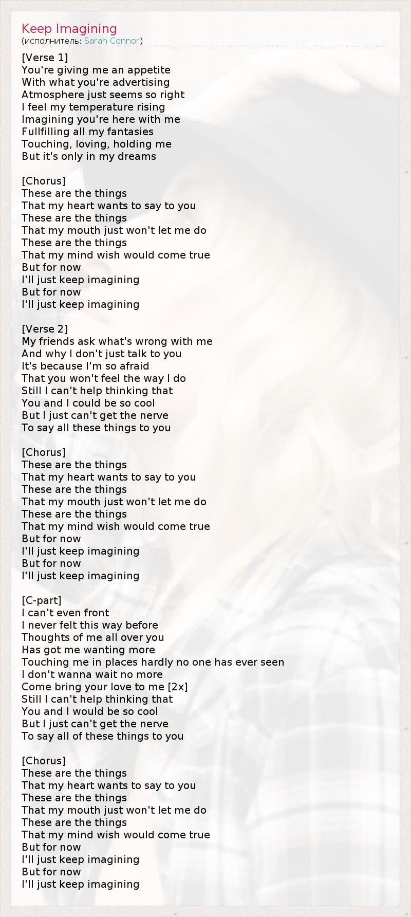 [Verse 1] You're giving me an appetite With what you're advertising Atmosphere just seems so right I feel my temperature rising Imagining you're here with me Fullfilling all my fantasies Touching, loving, holding me But it's only in my dreams [Chorus] These are the things That my heart wants to say to you These are the things That my mouth just won't let me do These are the things That my mind wish would come true But for now I'll just keep imagining But for now I'll just keep imagining [Verse 2] My friends ask what's wrong with me And why I don't just talk to you It's because I'm so afraid That you won't feel the way I do Still I can't help thinking that You and I could be so cool But I just can't get the nerve To say all these things to you [Chorus] These are the things That my heart wants to say to you These are the things That my mouth just won't let me do These are the things That my mind wish would come true But for now I'll just keep imagining But for now I'll just keep imagining [C-part] I can't even front I never felt this way before Thoughts of me all over you Has got me wanting more Touching me in places hardly no one has ever seen I don't wanna wait no more Come bring your love to me [2x] Still I can't help thinking that You and I would be so cool But I just can't get the nerve To say all of these things to you [Chorus] These are the things That my heart wants to say to you These are the things That my mouth just won't let me do These are the things That my mind wish would come true But for now I'll just keep imagining But for now I'll just keep imagining