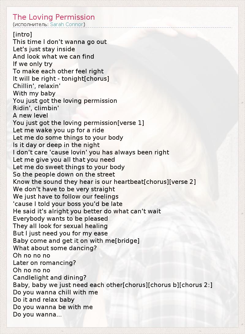 [intro] This time I don't wanna go out Let's just stay inside And look what we can find If we only try To make each other feel right It will be right - tonight[chorus] Chillin', relaxin' With my baby You just got the loving permission Ridin', climbin' A new level You just got the loving permission[verse 1] Let me wake you up for a ride Let me do some things to your body Is it day or deep in the night I don't care 'cause lovin' you has always been right Let me give you all that you need Let me do sweet things to your body So the people down on the street Know the sound they hear is our heartbeat[chorus][verse 2] We don't have to be very straight We just have to follow our feelings 'cause I told your boss you'd be late He said it's alright you better do what can't wait Everybody wants to be pleased They all look for sexual healing But I just need you for my ease Baby come and get it on with me[bridge] What about some dancing? Oh no no no Later on romancing? Oh no no no Candlelight and dining? Baby, baby we just need each other[chorus][chorus b][chorus 2:] Do you wanna chill with me Do it and relax baby Do you wanna be with me Do you wanna...