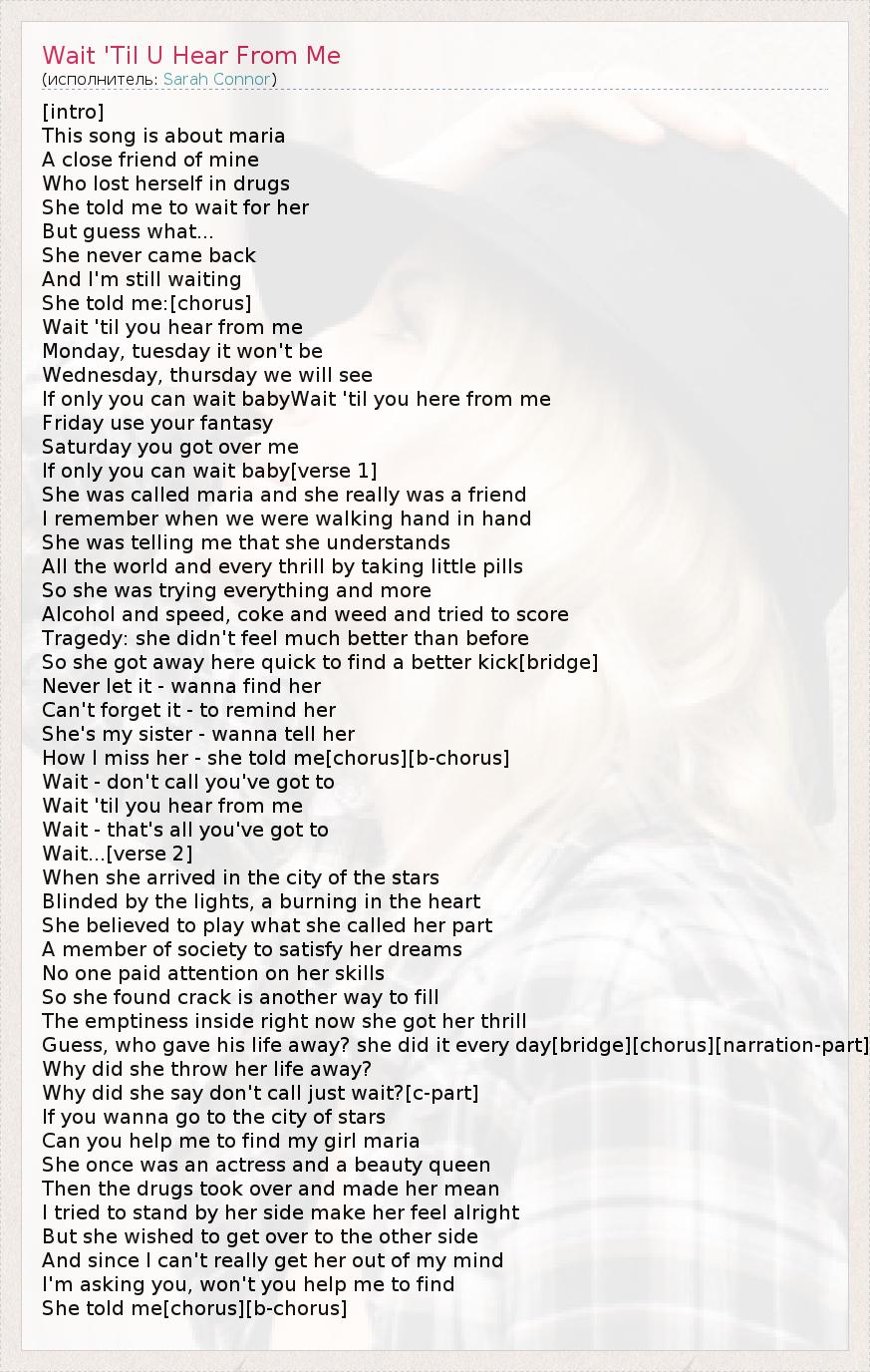 ГлавнаяИсполнителиSarah ConnorWait 'Til U Hear From Me