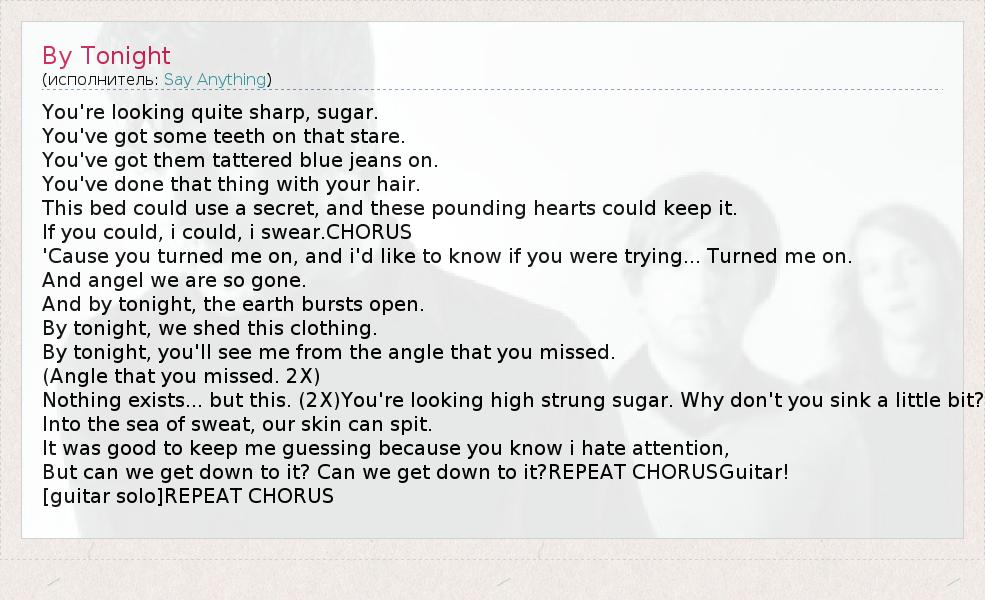 Это интересно:Say Anything - американская рок-группа из Лос-Анджелеса. Образована певцом и композитором Максом Бэмисом. Группа начала свое восхождение в 2001 году под именем Say Anything, в том же году группа выпустила альбом Baseball: An Album by Sayanything. В 2004 году вышел альбом "…Is a Real Boy". В 2007 году выпустили альбом "In Defense of the Genre". Последний альбом группы "Say Anything" выпущен на RCA Records 13 октября 2009 года.... продолжение