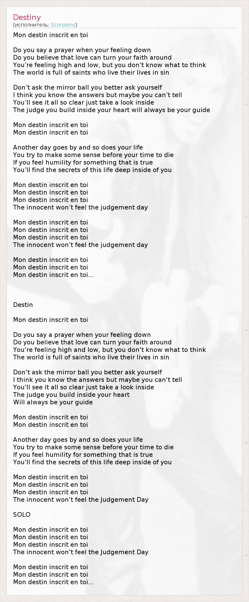 Mon destin inscrit en toi Do you say a prayer when your feeling down Do you believe that love can turn your faith around You’re feeling high and low, but you don’t know what to think The world is full of saints who live their lives in sin Don’t ask the mirror ball you better ask yourself I think you know the answers but maybe you can’t tell You’ll see it all so clear just take a look inside The judge you build inside your heart will always be your guide Mon destin inscrit en toi Mon destin inscrit en toi Another day goes by and so does your life You try to make some sense before your time to die If you feel humility for something that is true You’ll find the secrets of this life deep inside of you Mon destin inscrit en toi Mon destin inscrit en toi Mon destin inscrit en toi The innocent won’t feel the judgement day Mon destin inscrit en toi Mon destin inscrit en toi Mon destin inscrit en toi The innocent won’t feel the judgement day Mon destin inscrit en toi Mon destin inscrit en toi Mon destin inscrit en toi... Destin Mon destin inscrit en toi Do you say a prayer when your feeling down Do you believe that love can turn your faith around You're feeling high and low, but you don't know what to think The world is full of saints who live their lives in sin Don't ask the mirror ball you better ask yourself I think you know the answers but maybe you can't tell You'll see it all so clear just take a look inside The judge you build inside your heart Will always be your guide Mon destin inscrit en toi Mon destin inscrit en toi Another day goes by and so does your life You try to make some sense before your time to die If you feel humility for something that is true You'll find the secrets of this life deep inside of you Mon destin inscrit en toi Mon destin inscrit en toi Mon destin inscrit en toi The innocent won't feel the Judgement Day SOLO Mon destin inscrit en toi Mon destin inscrit en toi Mon destin inscrit en toi The innocent won't feel the Judgement Day Mon destin inscrit en toi Mon destin inscrit en toi Mon destin inscrit en toi...