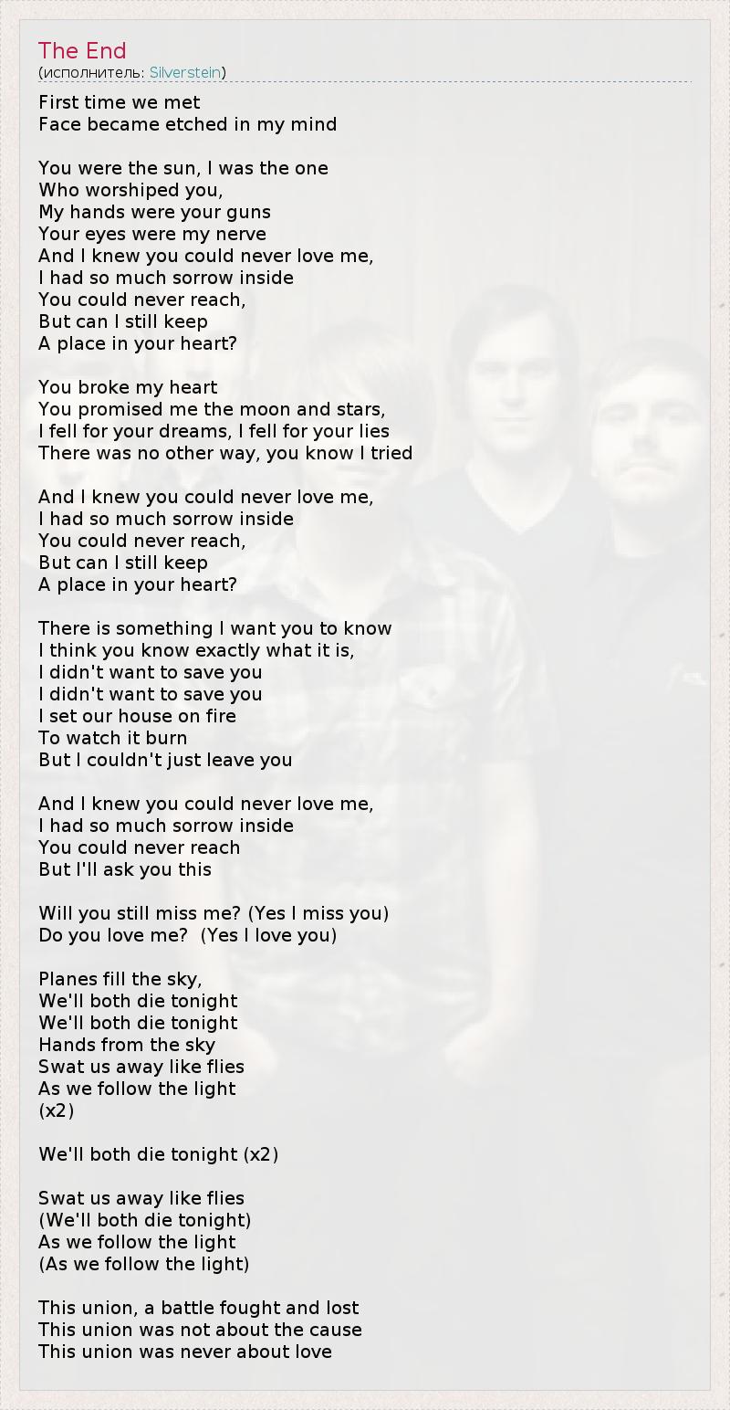 Когда мы впервые встретились, Твое лицо запечатлелось внутри меня Ты была солнцем, я был единственным, Кто обожал тебя, Мои руки были твоим оружием, Твои глаза были моими нервами Я знал, что ты никогда не могла любить меня, Столько печали было во мне, Тебе столько и не снилось, Но могу ли я сохранить Место в твоем сердце? Ты разбил мое сердце, Ты обещал мне луну и звезды, Я поверила твоим мечтам и твоей лжи, Не было другого выхода, знаешь, я пыталась Я знал, что ты никогда не могла любить меня, Столько печали было во мне, Тебе столько и не снилось, Но могу ли я сохранить Место в твоем сердце? Есть кое-что, я хочу чтобы ты это знала, Хотя думаю, что ты прекрасно знаешь, что это, Я не хотел тебя спасать, Я не хотел тебя спасать, Я подожгу наш дом, Чтобы смотреть, как он сгорает, Но я не могу просто оставить тебя Я знал, что ты никогда не могла любить меня, Столько печали было во мне, Тебе столько и не снилось, Но я спрошу у тебя: Ты все еще скучаешь по мне? (Да, скучаю) Ты меня любишь? (Да я люблю тебя) Самолеты наполняют небо, Мы оба умрем сегодня ночью, Мы оба умрем сегодня ночью, Руки с неба Раздавят нас как мух, Пока мы следуем за светом (х2) Мы оба умрем сегодня (x2) Раздавят нас как мух (Мы оба умрем сегодня ночью) Пока следуем за светом (Пока мы следуем за светом) Этот союз, проигранная битва, Этот союз не был причиной, Этот союз никогда не был союзом любви