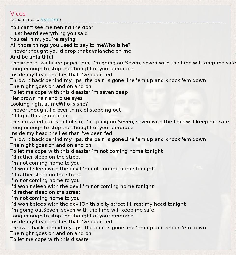 You can't see me behind the door I just heard everything you said You tell him, you're saying All those things you used to say to meWho is he? I never thought you'd drop that avalanche on me And be unfaithful These hotel walls are paper thin, I'm going outSeven, seven with the lime will keep me safe Long enough to stop the thought of your embrace Inside my head the lies that I've been fed Throw it back behind my lips, the pain is goneLine 'em up and knock 'em down The night goes on and on and on To let me cope with this disasterI'm seven deep Her brown hair and blue eyes Looking right at meWho is she? I never thought I'd ever think of stepping out I'll fight this temptation This crowded bar is full of sin, I'm going outSeven, seven with the lime will keep me safe Long enough to stop the thought of your embrace Inside my head the lies that I've been fed Throw it back behind my lips, the pain is goneLine 'em up and knock 'em down The night goes on and on and on To let me cope with this disasterI'm not coming home tonight I'd rather sleep on the street I'm not coming home to you I'd won't sleep with the devilI'm not coming home tonight I'd rather sleep on the street I'm not coming home to you I'd won't sleep with the devilI'm not coming home tonight I'd rather sleep on the street I'm not coming home to you I'd won't sleep with the devilOn this city street I'll rest my head tonight I'm going outSeven, seven with the lime will keep me safe Long enough to stop the thought of your embrace Inside my head the lies that I've been fed Throw it back behind my lips, the pain is goneLine 'em up and knock 'em down The night goes on and on and on To let me cope with this disaster