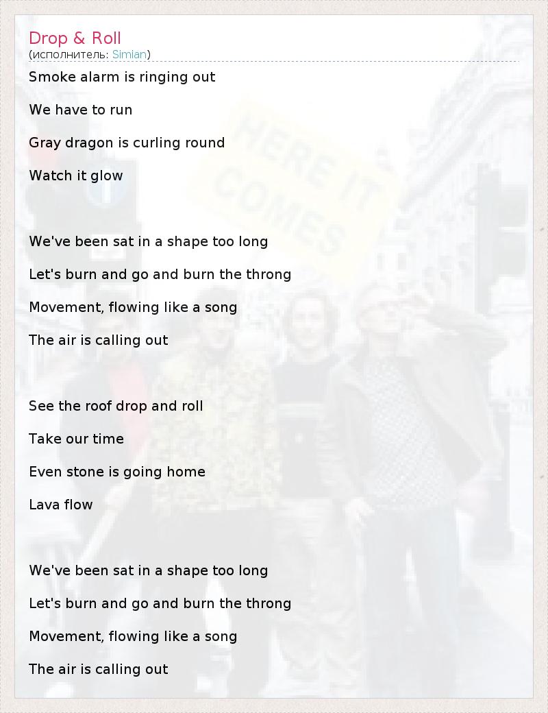 Smoke alarm is ringing out We have to run Gray dragon is curling round Watch it glow We've been sat in a shape too long Let's burn and go and burn the throng Movement, flowing like a song The air is calling out See the roof drop and roll Take our time Even stone is going home Lava flow We've been sat in a shape too long Let's burn and go and burn the throng Movement, flowing like a song The air is calling out