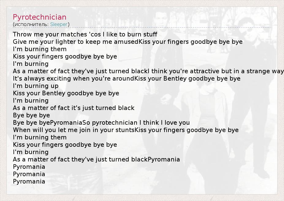 Bye bye byePyromaniaSo pyrotechnician I think I love you