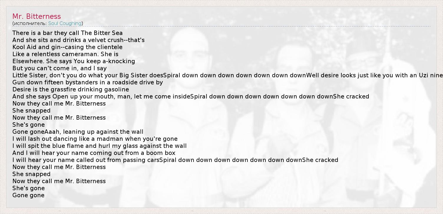 There is a bar they call The Bitter Sea And she sits and drinks a velvet crush--that's Kool Aid and gin--casing the clientele Like a relentless cameraman. She is Elsewhere. She says You keep a-knocking But you can't come in, and I say Little Sister, don't you do what your Big Sister doesSpiral down down down down down down downWell desire looks just like you with an Uzi nine Gun down fifteen bystanders in a roadside drive by Desire is the grassfire drinking gasoline And she says Open up your mouth, man, let me come insideSpiral down down down down down down downShe cracked Now they call me Mr. Bitterness She snapped Now they call me Mr. Bitterness She's gone Gone goneAaah, leaning up against the wall I will lash out dancing like a madman when you're gone I will spit the blue flame and hurl my glass against the wall And I will hear your name coming out from a boom box I will hear your name called out from passing carsSpiral down down down down down down downShe cracked Now they call me Mr. Bitterness She snapped Now they call me Mr. Bitterness She's gone Gone gone