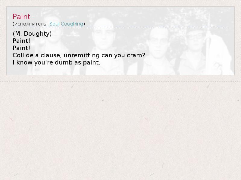 (M. Doughty) Paint! Paint! Collide a clause, unremitting can you cram? I know you're dumb as paint.