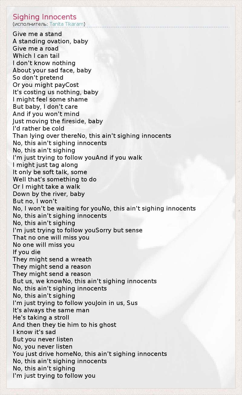 Give me a stand A standing ovation, baby Give me a road Which I can tail I don't know nothing About your sad face, baby So don't pretend Or you might payCost It's costing us nothing, baby I might feel some shame But baby, I don't care And if you won't mind Just moving the fireside, baby I'd rather be cold Than lying over thereNo, this ain't sighing innocents No, this ain't sighing innocents No, this ain't sighing I'm just trying to follow youAnd if you walk I might just tag along It only be soft talk, some Well that's something to do Or I might take a walk Down by the river, baby But no, I won't No, I won't be waiting for youNo, this ain't sighing innocents No, this ain't sighing innocents No, this ain't sighing I'm just trying to follow youSorry but sense That no one will miss you No one will miss you If you die They might send a wreath They might send a reason They might send a reason But us, we knowNo, this ain't sighing innocents No, this ain't sighing innocents No, this ain't sighing I'm just trying to follow youJoin in us, Sus It's always the same man He's taking a stroll And then they tie him to his ghost I know it's sad But you never listen No, you never listen You just drive homeNo, this ain't sighing innocents No, this ain't sighing innocents No, this ain't sighing I'm just trying to follow you