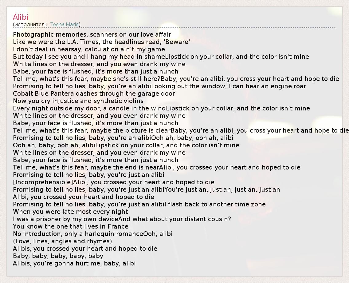 Photographic memories, scanners on our love affair Like we were the L.A. Times, the headlines read, 'Beware' I don't deal in hearsay, calculation ain't my game But today I see you and I hang my head in shameLipstick on your collar, and the color isn't mine White lines on the dresser, and you even drank my wine Babe, your face is flushed, it's more than just a hunch Tell me, what's this fear, maybe she's still here?Baby, you're an alibi, you cross your heart and hope to die Promising to tell no lies, baby, you're an alibiLooking out the window, I can hear an engine roar Cobalt Blue Pantera dashes through the garage door Now you cry injustice and synthetic violins Every night outside my door, a candle in the windLipstick on your collar, and the color isn't mine White lines on the dresser, and you even drank my wine Babe, your face is flushed, it's more than just a hunch Tell me, what's this fear, maybe the picture is clearBaby, you're an alibi, you cross your heart and hope to die Promising to tell no lies, baby, you're an alibiOoh ah, baby, ooh ah, alibi Ooh ah, baby, ooh ah, alibiLipstick on your collar, and the color isn't mine White lines on the dresser, and you even drank my wine Babe, your face is flushed, it's more than just a hunch Tell me, what's this fear, maybe the end is nearAlibi, you crossed your heart and hoped to die Promising to tell no lies, baby, you're just an alibi [Incomprehensible]Alibi, you crossed your heart and hoped to die Promising to tell no lies, baby, you're just an alibiYou're just an, just an, just an, just an Alibi, you crossed your heart and hoped to die Promising to tell no lies, baby, you're just an alibiI flash back to another time zone When you were late most every night I was a prisoner by my own deviceAnd what about your distant cousin? You know the one that lives in France No introduction, only a harlequin romanceOoh, alibi (Love, lines, angles and rhymes) Alibis, you crossed your heart and hoped to die Baby, baby, baby, baby, baby Alibis, you're gonna hurt me, baby, alibi