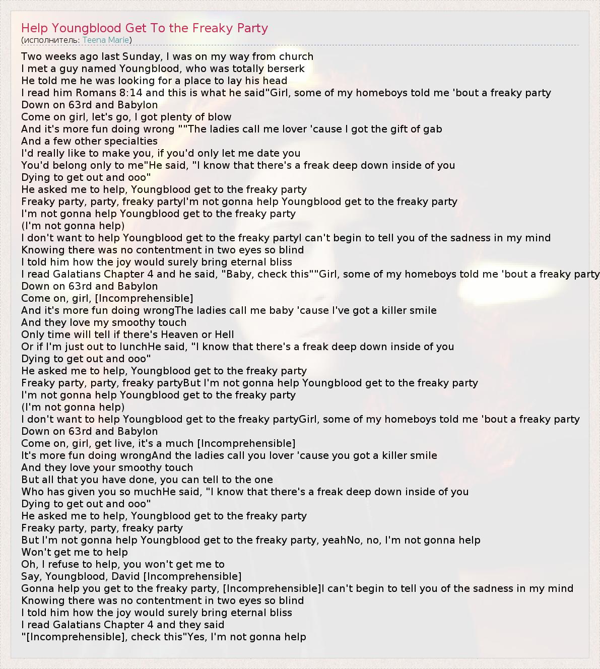 А как ты думаешь, о чем песня "Help Youngblood Get To the Freaky Party" ?