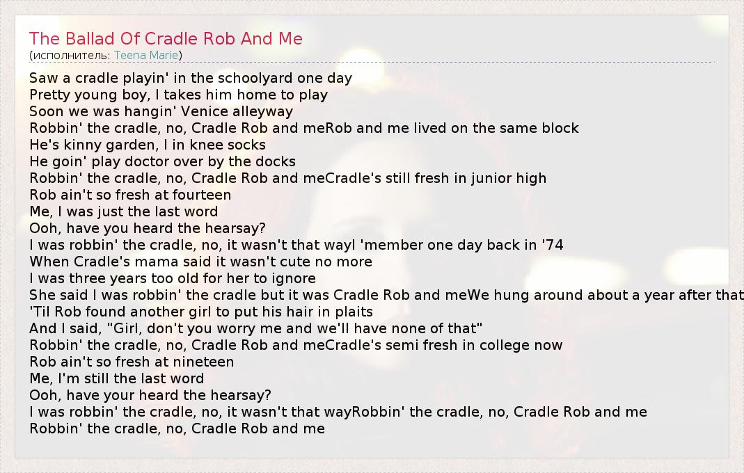 ГлавнаяИсполнителиTeena MarieThe Ballad Of Cradle Rob And Me