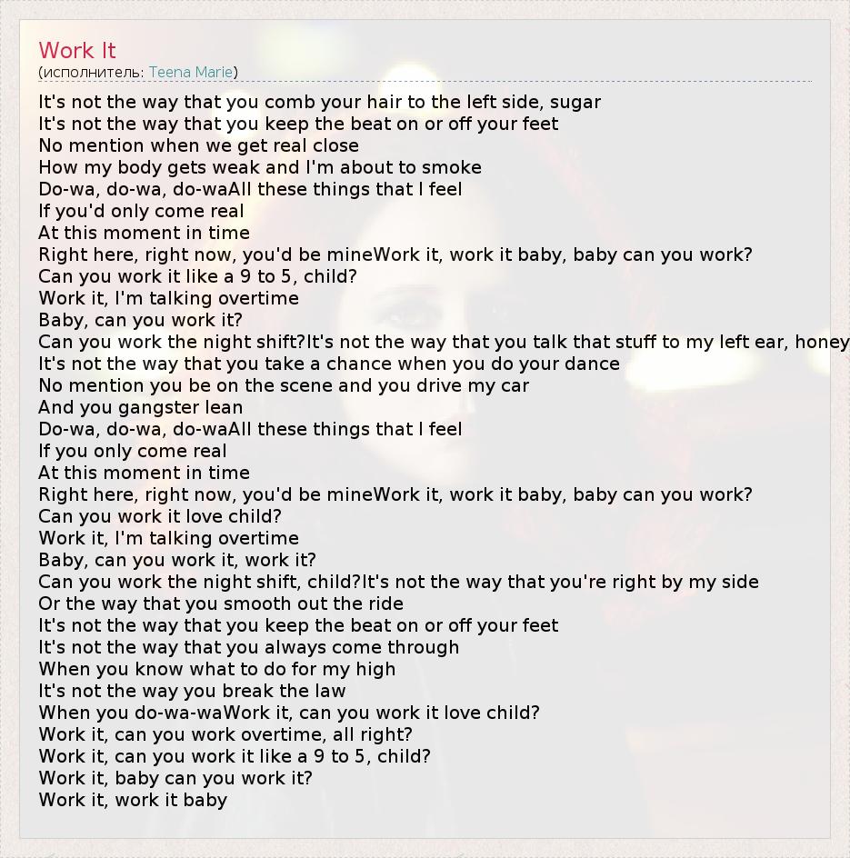 It's not the way that you comb your hair to the left side, sugar It's not the way that you keep the beat on or off your feet No mention when we get real close How my body gets weak and I'm about to smoke Do-wa, do-wa, do-waAll these things that I feel If you'd only come real At this moment in time Right here, right now, you'd be mineWork it, work it baby, baby can you work? Can you work it like a 9 to 5, child? Work it, I'm talking overtime Baby, can you work it? Can you work the night shift?It's not the way that you talk that stuff to my left ear, honey It's not the way that you take a chance when you do your dance No mention you be on the scene and you drive my car And you gangster lean Do-wa, do-wa, do-waAll these things that I feel If you only come real At this moment in time Right here, right now, you'd be mineWork it, work it baby, baby can you work? Can you work it love child? Work it, I'm talking overtime Baby, can you work it, work it? Can you work the night shift, child?It's not the way that you're right by my side Or the way that you smooth out the ride It's not the way that you keep the beat on or off your feet It's not the way that you always come through When you know what to do for my high It's not the way you break the law When you do-wa-waWork it, can you work it love child? Work it, can you work overtime, all right? Work it, can you work it like a 9 to 5, child? Work it, baby can you work it? Work it, work it baby