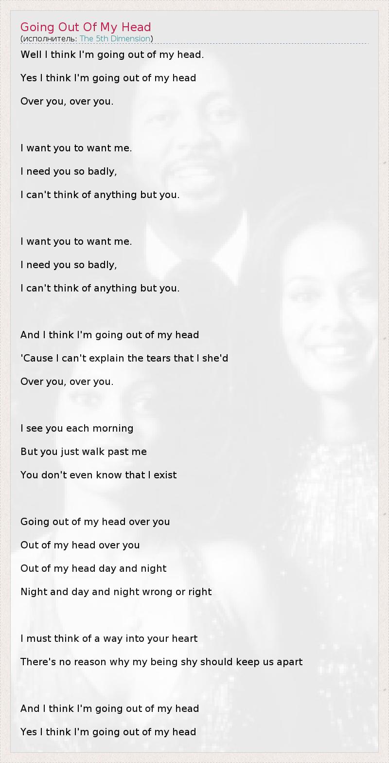 Well I think I'm going out of my head. Yes I think I'm going out of my head Over you, over you. I want you to want me. I need you so badly, I can't think of anything but you. I want you to want me. I need you so badly, I can't think of anything but you. And I think I'm going out of my head 'Cause I can't explain the tears that I she'd Over you, over you. I see you each morning But you just walk past me You don't even know that I exist Going out of my head over you Out of my head over you Out of my head day and night Night and day and night wrong or right I must think of a way into your heart There's no reason why my being shy should keep us apart And I think I'm going out of my head Yes I think I'm going out of my head