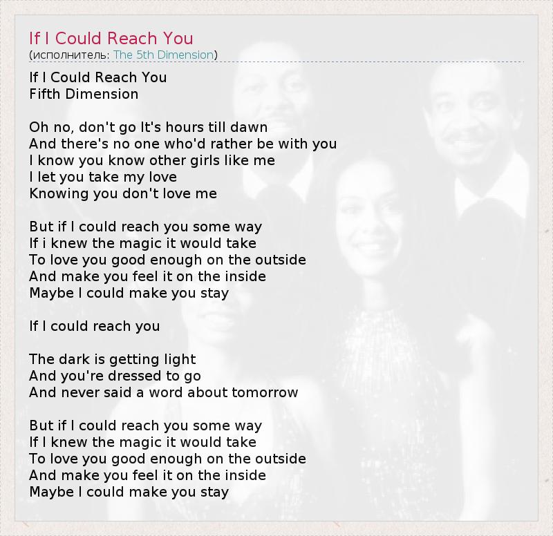 If I Could Reach You Fifth Dimension Oh no, don't go It's hours till dawn And there's no one who'd rather be with you I know you know other girls like me I let you take my love Knowing you don't love me But if I could reach you some way If i knew the magic it would take To love you good enough on the outside And make you feel it on the inside Maybe I could make you stay If I could reach you The dark is getting light And you're dressed to go And never said a word about tomorrow But if I could reach you some way If I knew the magic it would take To love you good enough on the outside And make you feel it on the inside Maybe I could make you stay