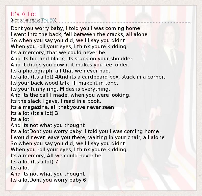 Dont you worry baby, I told you I was coming home. I went into the back, fell between the cracks, all alone. So when you say you did, well I say you didnt. When you roll your eyes, I think youre kidding. Its a memory; that we could never be. And its big and black, its stuck on your shoulder. And it drags you down, it makes you feel older. Its a photograph, all that we never had. Its a lot (Its a lot) 4And its a cardboard box, stuck in a corner. Its your back wood talk, Ill make it in tone. Its your funny ring. Midas is everything. And its the call I made, when you were looking. Its the slack I gave, I read in a book. Its a magazine, all that youve never seen. Its a lot (Its a lot) 3 Its a lot And its not what you thought Its a lotDont you worry baby, I told you I was coming home. I would never leave you there, waiting in your chair, all alone. So when you say you did, well I say you didnt. When you roll your eyes, I think youre kidding. Its a memory; All we could never be. Its a lot (Its a lot) 7 Its a lot And its not what you thought Its a lotDont you worry baby 6