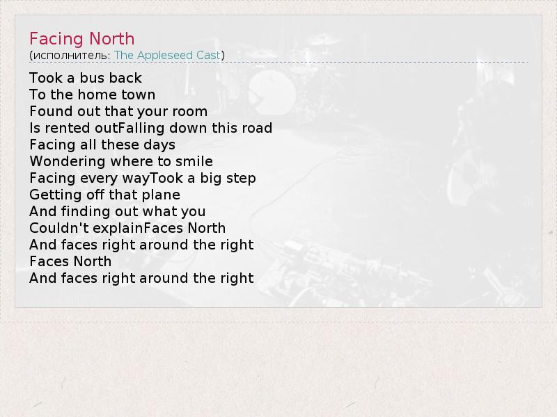 Это интересно:The Appleseed Cast - группа из города Лоуренс, штат Канзас, играющая смесь из indie / emo / post-rock / alternative rock.“Основание и дебют (1997 - 1998)”Инди группа The Appleseed Cast была образована в 1997 году в Южной Калифорнии музыкантами: Christopher Crisci, Jason Wickersheim и Louie Ruiz и изначально называлась December's Tragic Drive (название коллектива - фраза, взятая из песни “Seven"... продолжение