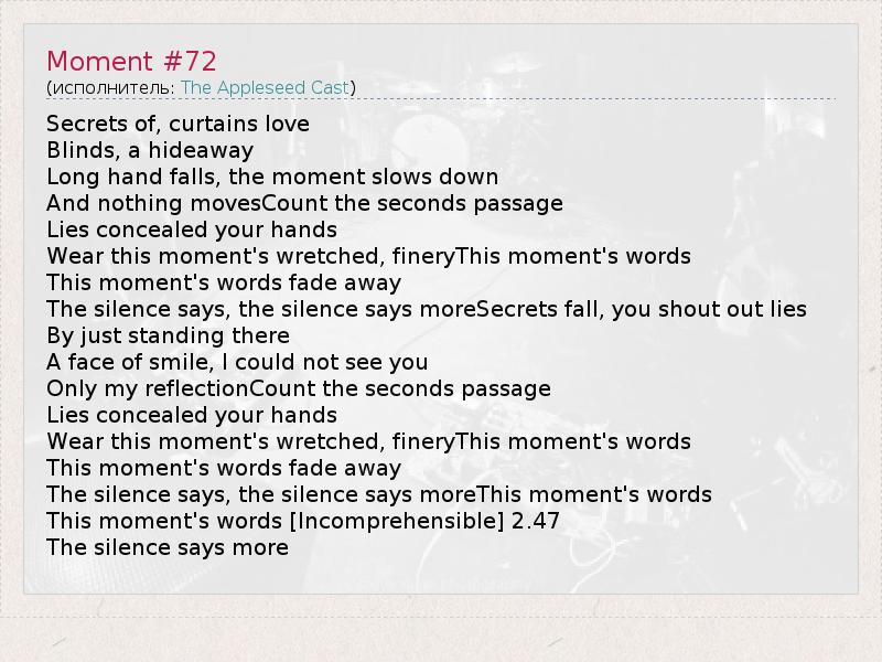 Это интересно:The Appleseed Cast - группа из города Лоуренс, штат Канзас, играющая смесь из indie / emo / post-rock / alternative rock.“Основание и дебют (1997 - 1998)”Инди группа The Appleseed Cast была образована в 1997 году в Южной Калифорнии музыкантами: Christopher Crisci, Jason Wickersheim и Louie Ruiz и изначально называлась December's Tragic Drive (название коллектива - фраза, взятая из песни “Seven"... продолжение
