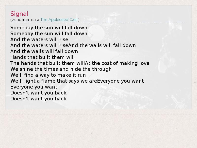 Someday the sun will fall down Someday the sun will fall down And the waters will rise And the waters will riseAnd the walls will fall down And the walls will fall down Hands that built them will The hands that built them willAt the cost of making love We shine the times and hide the through We'll find a way to make it run We'll light a flame that says we areEveryone you want Everyone you want Doesn't want you back Doesn't want you back
