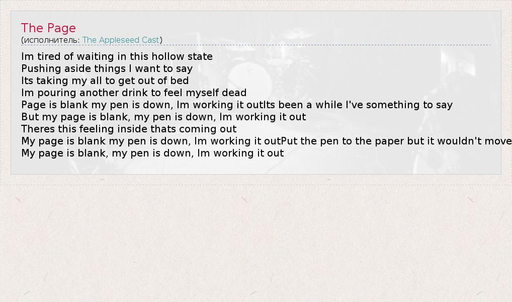 Это интересно:The Appleseed Cast - группа из города Лоуренс, штат Канзас, играющая смесь из indie / emo / post-rock / alternative rock.“Основание и дебют (1997 - 1998)”Инди группа The Appleseed Cast была образована в 1997 году в Южной Калифорнии музыкантами: Christopher Crisci, Jason Wickersheim и Louie Ruiz и изначально называлась December's Tragic Drive (название коллектива - фраза, взятая из песни “Seven"... продолжение