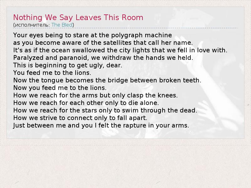 А как ты думаешь, о чем песня "Nothing We Say Leaves This Room" ?
