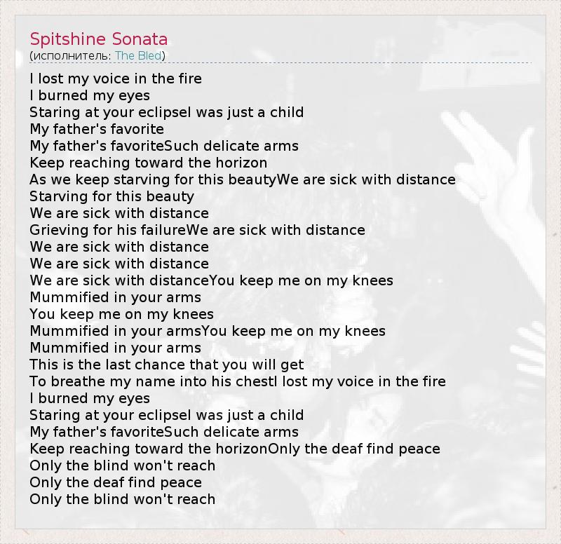 I lost my voice in the fire I burned my eyes Staring at your eclipseI was just a child My father's favorite My father's favoriteSuch delicate arms Keep reaching toward the horizon As we keep starving for this beautyWe are sick with distance Starving for this beauty We are sick with distance Grieving for his failureWe are sick with distance We are sick with distance We are sick with distance We are sick with distanceYou keep me on my knees Mummified in your arms You keep me on my knees Mummified in your armsYou keep me on my knees Mummified in your arms This is the last chance that you will get To breathe my name into his chestI lost my voice in the fire I burned my eyes Staring at your eclipseI was just a child My father's favoriteSuch delicate arms Keep reaching toward the horizonOnly the deaf find peace Only the blind won't reach Only the deaf find peace Only the blind won't reach