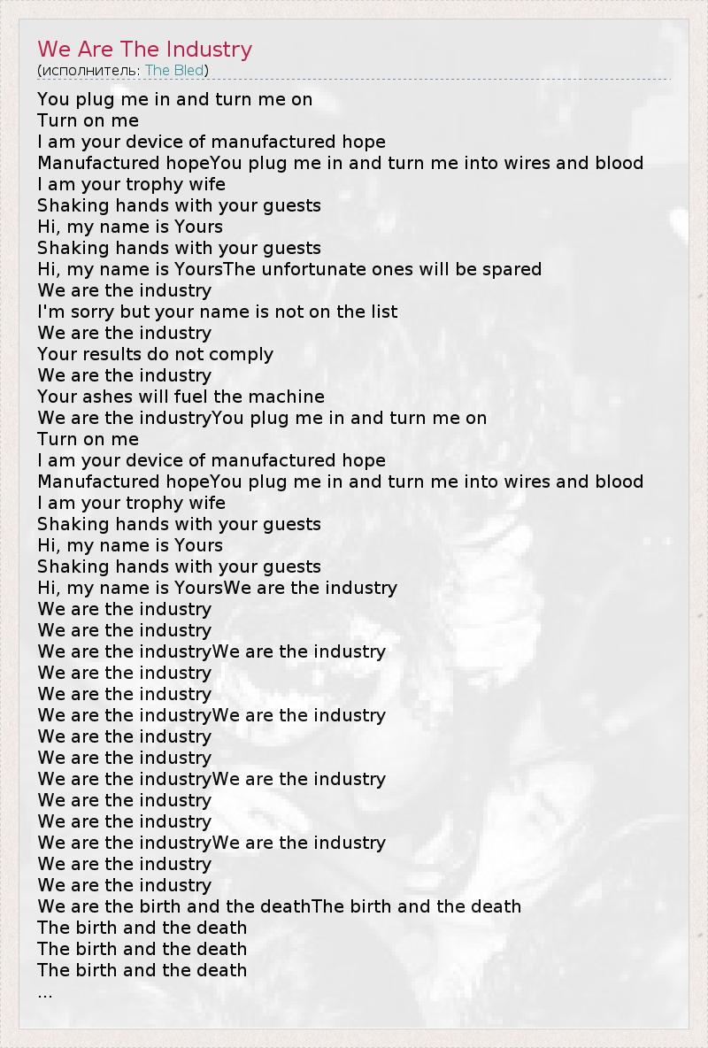 You plug me in and turn me on Turn on me I am your device of manufactured hope Manufactured hopeYou plug me in and turn me into wires and blood I am your trophy wife Shaking hands with your guests Hi, my name is Yours Shaking hands with your guests Hi, my name is YoursThe unfortunate ones will be spared We are the industry I'm sorry but your name is not on the list We are the industry Your results do not comply We are the industry Your ashes will fuel the machine We are the industryYou plug me in and turn me on Turn on me I am your device of manufactured hope Manufactured hopeYou plug me in and turn me into wires and blood I am your trophy wife Shaking hands with your guests Hi, my name is Yours Shaking hands with your guests Hi, my name is YoursWe are the industry We are the industry We are the industry We are the industryWe are the industry We are the industry We are the industry We are the industryWe are the industry We are the industry We are the industry We are the industryWe are the industry We are the industry We are the industry We are the industryWe are the industry We are the industry We are the industry We are the birth and the deathThe birth and the death The birth and the death The birth and the death The birth and the death ...