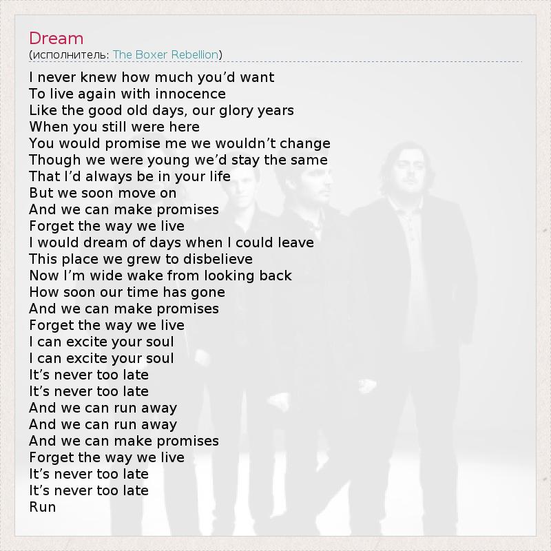 Это интересно:The Boxer Rebellion – международный рок-проект, в состав которого входят 4 участника из разных стран мира - Натан Николсон (Nathan Nicholson) (Vocals/Guitar/Keys) из США, Тодд Хоу (Todd Howe) (Lead Guitar) из Австралии и двое англичан - Адам Харрисон (Adam Harrison) (Bass Guitar) и Пьерс Хьюит (Piers Hewitt) (Drums). Группа впервые собралась в 2001 году. На их счету... продолжение