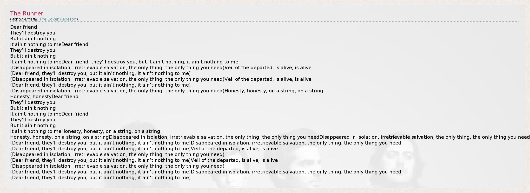 Это интересно:The Boxer Rebellion – международный рок-проект, в состав которого входят 4 участника из разных стран мира - Натан Николсон (Nathan Nicholson) (Vocals/Guitar/Keys) из США, Тодд Хоу (Todd Howe) (Lead Guitar) из Австралии и двое англичан - Адам Харрисон (Adam Harrison) (Bass Guitar) и Пьерс Хьюит (Piers Hewitt) (Drums). Группа впервые собралась в 2001 году. На их счету... продолжение