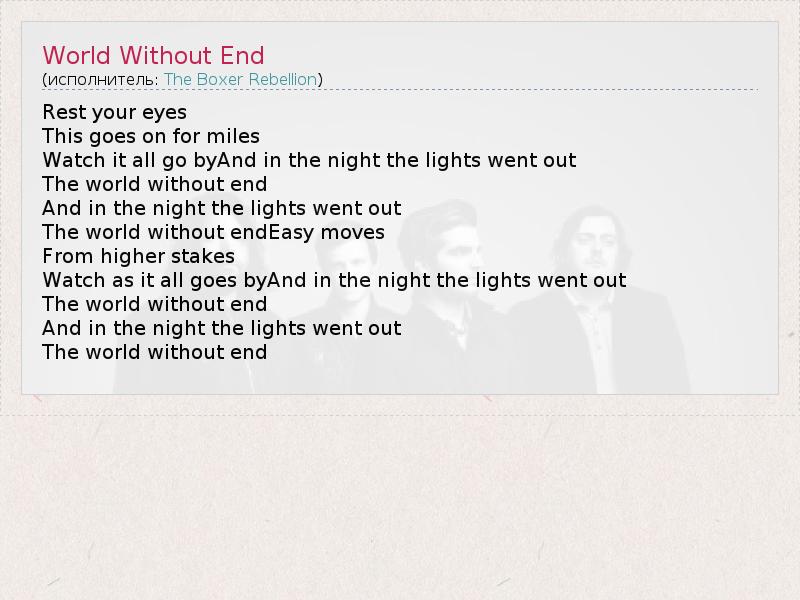 Rest your eyes This goes on for miles Watch it all go byAnd in the night the lights went out The world without end And in the night the lights went out The world without endEasy moves From higher stakes Watch as it all goes byAnd in the night the lights went out The world without end And in the night the lights went out The world without end