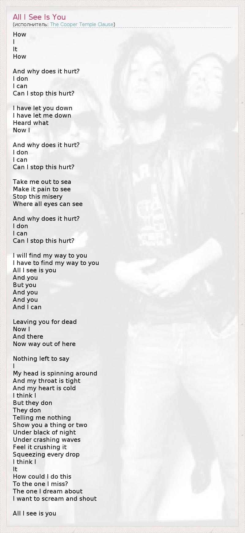 How I It How And why does it hurt? I don I can Can I stop this hurt? I have let you down I have let me down Heard what Now I And why does it hurt? I don I can Can I stop this hurt? Take me out to sea Make it pain to see Stop this misery Where all eyes can see And why does it hurt? I don I can Can I stop this hurt? I will find my way to you I have to find my way to you All I see is you And you But you And you And you And I can Leaving you for dead Now I And there Now way out of here Nothing left to say I My head is spinning around And my throat is tight And my heart is cold I think I But they don They don Telling me nothing Show you a thing or two Under black of night Under crashing waves Feel it crushing it Squeezing every drop I think I It How could I do this To the one I miss? The one I dream about I want to scream and shout All I see is you