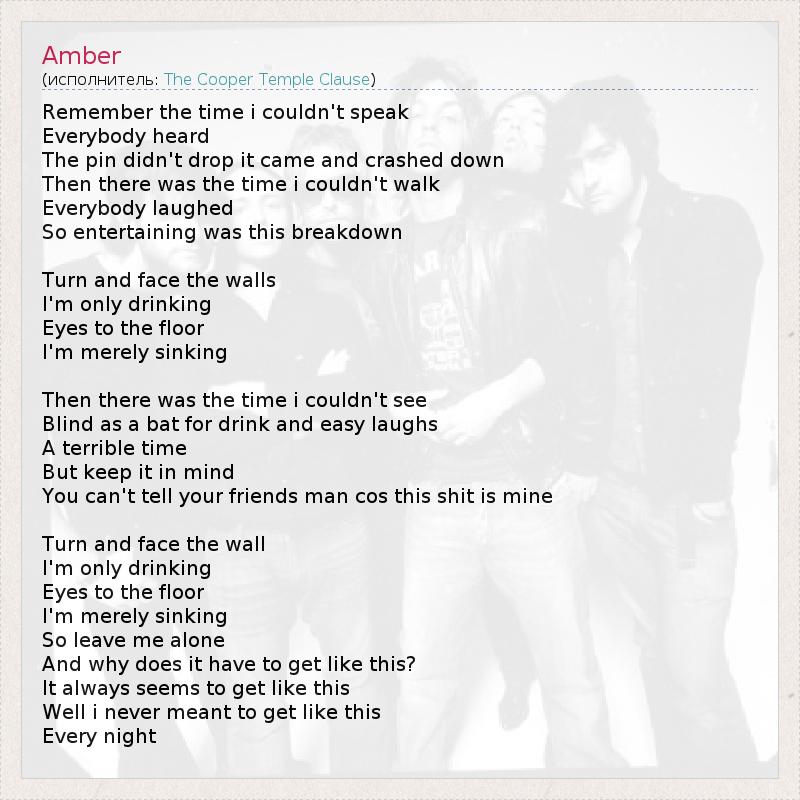 Remember the time i couldn't speak Everybody heard The pin didn't drop it came and crashed down Then there was the time i couldn't walk Everybody laughed So entertaining was this breakdown Turn and face the walls I'm only drinking Eyes to the floor I'm merely sinking Then there was the time i couldn't see Blind as a bat for drink and easy laughs A terrible time But keep it in mind You can't tell your friends man cos this shit is mine Turn and face the wall I'm only drinking Eyes to the floor I'm merely sinking So leave me alone And why does it have to get like this? It always seems to get like this Well i never meant to get like this Every night