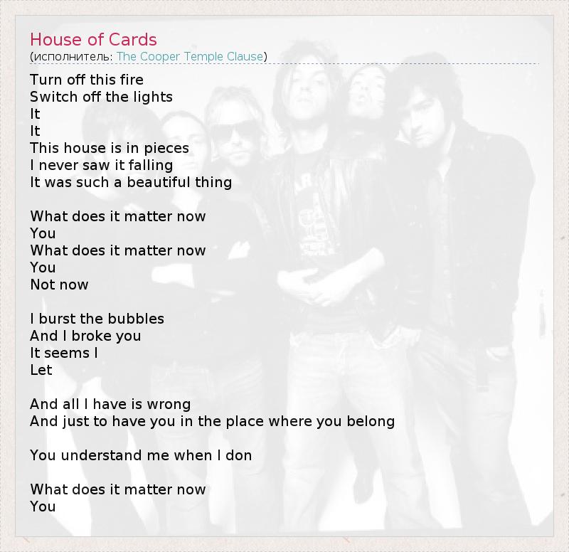 Turn off this fire Switch off the lights It It This house is in pieces I never saw it falling It was such a beautiful thing What does it matter now You What does it matter now You Not now I burst the bubbles And I broke you It seems I Let And all I have is wrong And just to have you in the place where you belong You understand me when I don What does it matter now You