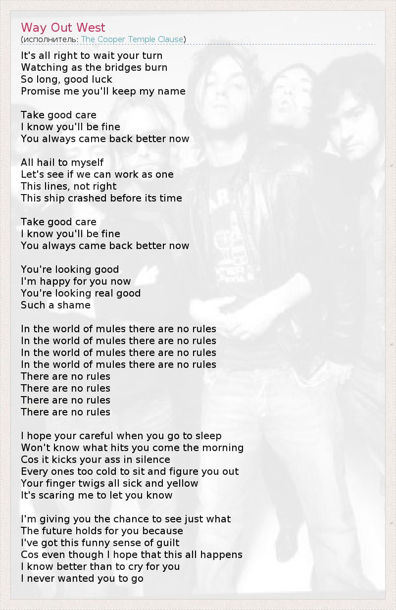 It's all right to wait your turn Watching as the bridges burn So long, good luck Promise me you'll keep my name Take good care I know you'll be fine You always came back better now All hail to myself Let's see if we can work as one This lines, not right This ship crashed before its time Take good care I know you'll be fine You always came back better now You're looking good I'm happy for you now You're looking real good Such a shame In the world of mules there are no rules In the world of mules there are no rules In the world of mules there are no rules In the world of mules there are no rules There are no rules There are no rules There are no rules There are no rules I hope your careful when you go to sleep Won't know what hits you come the morning Cos it kicks your ass in silence Every ones too cold to sit and figure you out Your finger twigs all sick and yellow It's scaring me to let you know I'm giving you the chance to see just what The future holds for you because I've got this funny sense of guilt Cos even though I hope that this all happens I know better than to cry for you I never wanted you to go