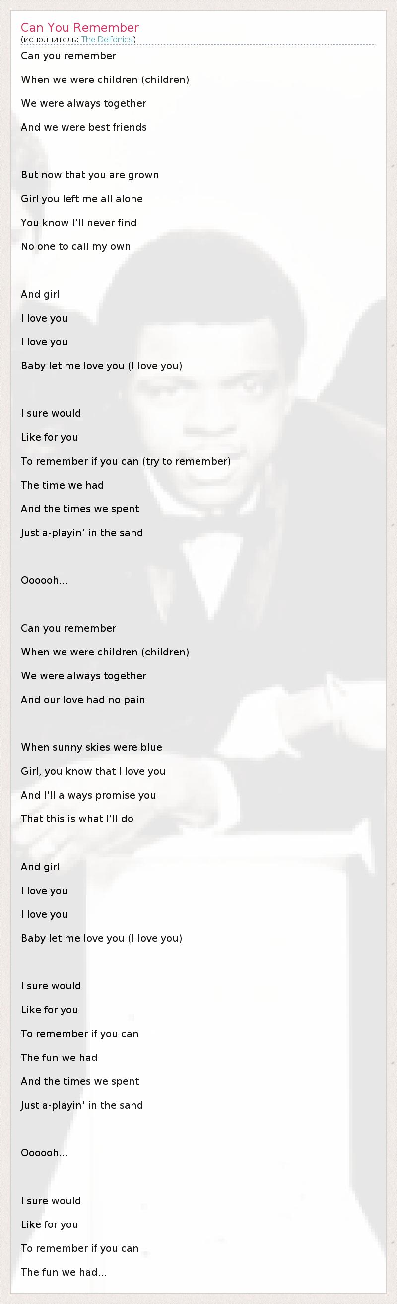 Can you remember When we were children (children) We were always together And we were best friends But now that you are grown Girl you left me all alone You know I'll never find No one to call my own And girl I love you I love you Baby let me love you (I love you) I sure would Like for you To remember if you can (try to remember) The time we had And the times we spent Just a-playin' in the sand Oooooh... Can you remember When we were children (children) We were always together And our love had no pain When sunny skies were blue Girl, you know that I love you And I'll always promise you That this is what I'll do And girl I love you I love you Baby let me love you (I love you) I sure would Like for you To remember if you can The fun we had And the times we spent Just a-playin' in the sand Oooooh... I sure would Like for you To remember if you can The fun we had...