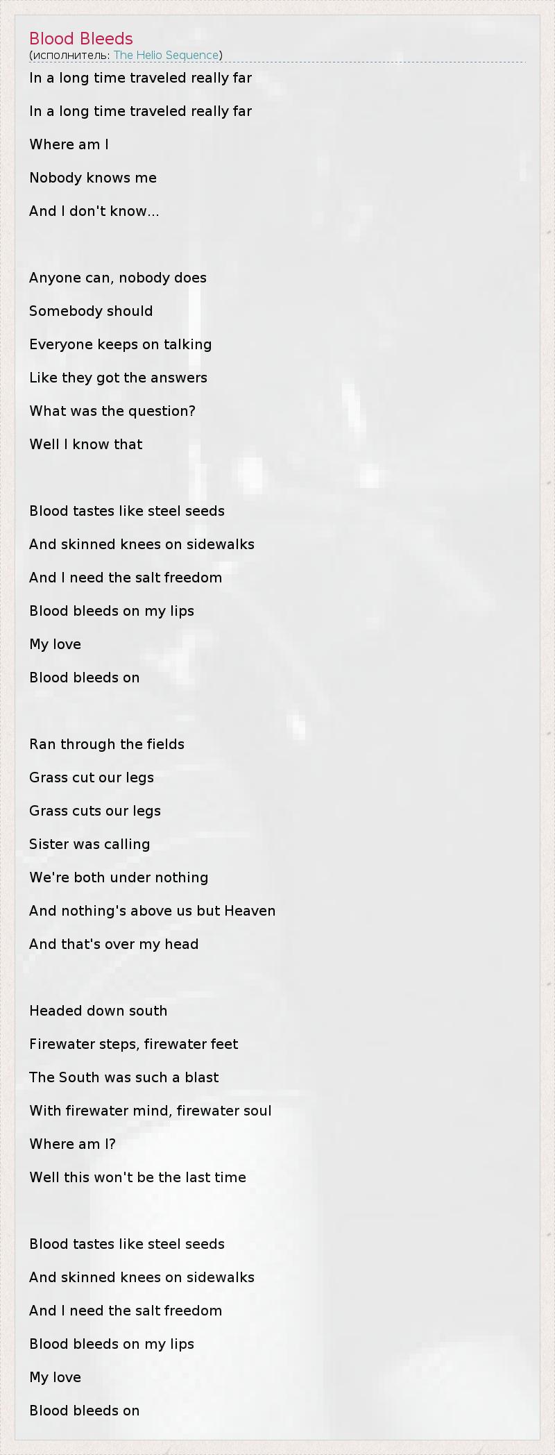 In a long time traveled really far In a long time traveled really far Where am I Nobody knows me And I don't know... Anyone can, nobody does Somebody should Everyone keeps on talking Like they got the answers What was the question? Well I know that Blood tastes like steel seeds And skinned knees on sidewalks And I need the salt freedom Blood bleeds on my lips My love Blood bleeds on Ran through the fields Grass cut our legs Grass cuts our legs Sister was calling We're both under nothing And nothing's above us but Heaven And that's over my head Headed down south Firewater steps, firewater feet The South was such a blast With firewater mind, firewater soul Where am I? Well this won't be the last time Blood tastes like steel seeds And skinned knees on sidewalks And I need the salt freedom Blood bleeds on my lips My love Blood bleeds on