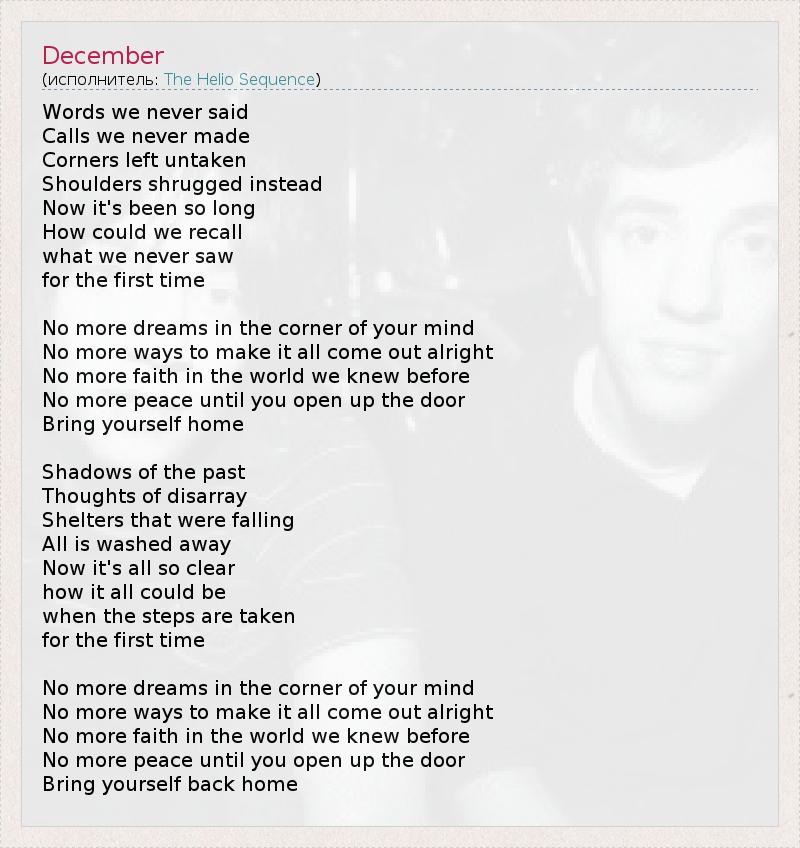 Words we never said Calls we never made Corners left untaken Shoulders shrugged instead Now it's been so long How could we recall what we never saw for the first time No more dreams in the corner of your mind No more ways to make it all come out alright No more faith in the world we knew before No more peace until you open up the door Bring yourself home Shadows of the past Thoughts of disarray Shelters that were falling All is washed away Now it's all so clear how it all could be when the steps are taken for the first time No more dreams in the corner of your mind No more ways to make it all come out alright No more faith in the world we knew before No more peace until you open up the door Bring yourself back home