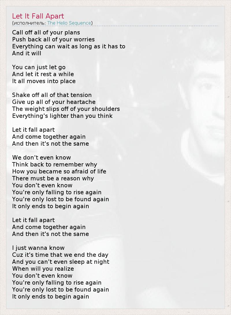 Call off all of your plans Push back all of your worries Everything can wait as long as it has to And it will You can just let go And let it rest a while It all moves into place Shake off all of that tension Give up all of your heartache The weight slips off of your shoulders Everything's lighter than you think Let it fall apart And come together again And then it's not the same We don't even know Think back to remember why How you became so afraid of life There must be a reason why You don't even know You're only falling to rise again You're only lost to be found again It only ends to begin again Let it fall apart And come together again And then it's not the same I just wanna know Cuz it's time that we end the day And you can't even sleep at night When will you realize You don't even know You're only falling to rise again You're only lost to be found again It only ends to begin again