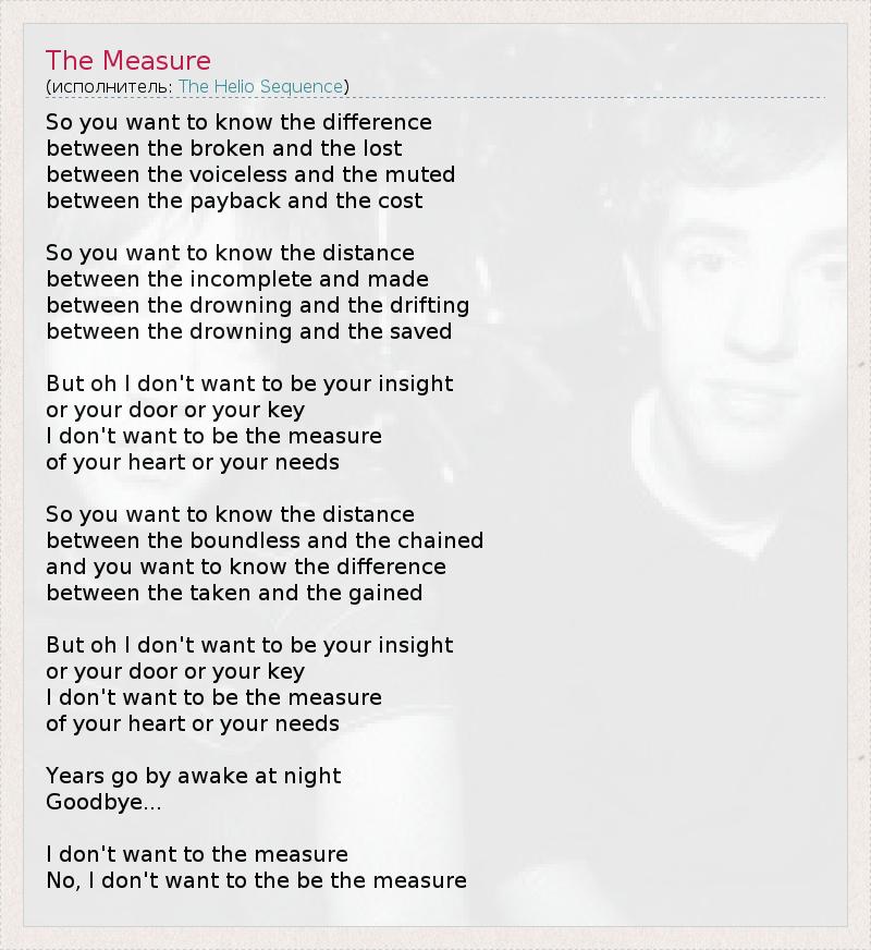 So you want to know the difference between the broken and the lost between the voiceless and the muted between the payback and the cost So you want to know the distance between the incomplete and made between the drowning and the drifting between the drowning and the saved But oh I don't want to be your insight or your door or your key I don't want to be the measure of your heart or your needs So you want to know the distance between the boundless and the chained and you want to know the difference between the taken and the gained But oh I don't want to be your insight or your door or your key I don't want to be the measure of your heart or your needs Years go by awake at night Goodbye... I don't want to the measure No, I don't want to the be the measure